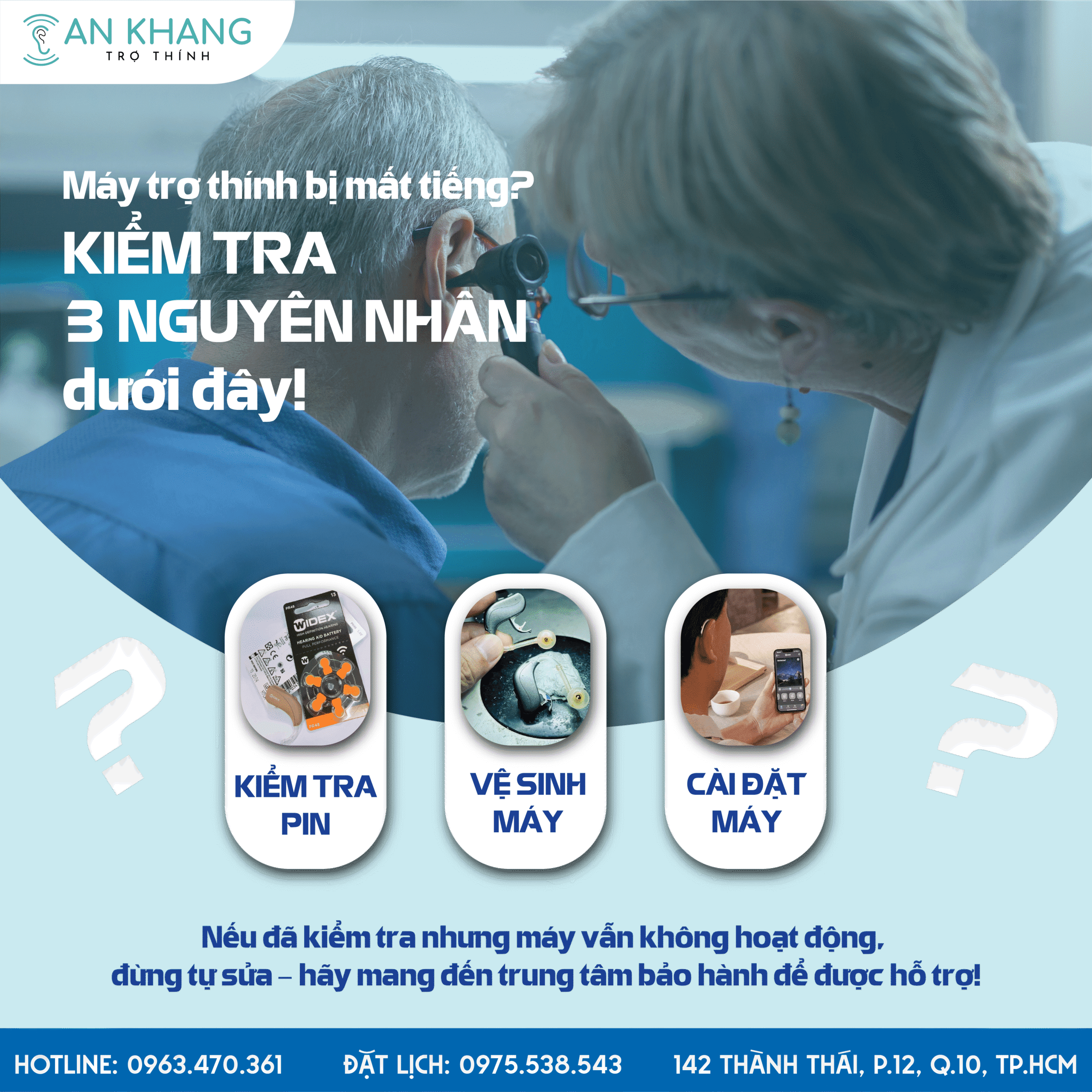 Nếu sau khi kiểm tra cả 3 nguyên nhân trên mà máy vẫn không phát âm thanh, bạn nên mang máy đến cơ sở chuyên môn để được kỹ thuật viên kiểm tra chuyên sâu. Tại Trợ Thính An Khang, chúng tôi hỗ trợ kiểm tra máy miễn phí, bảo dưỡng và vệ sinh định kỳ để thiết bị luôn hoạt động tốt nhất.